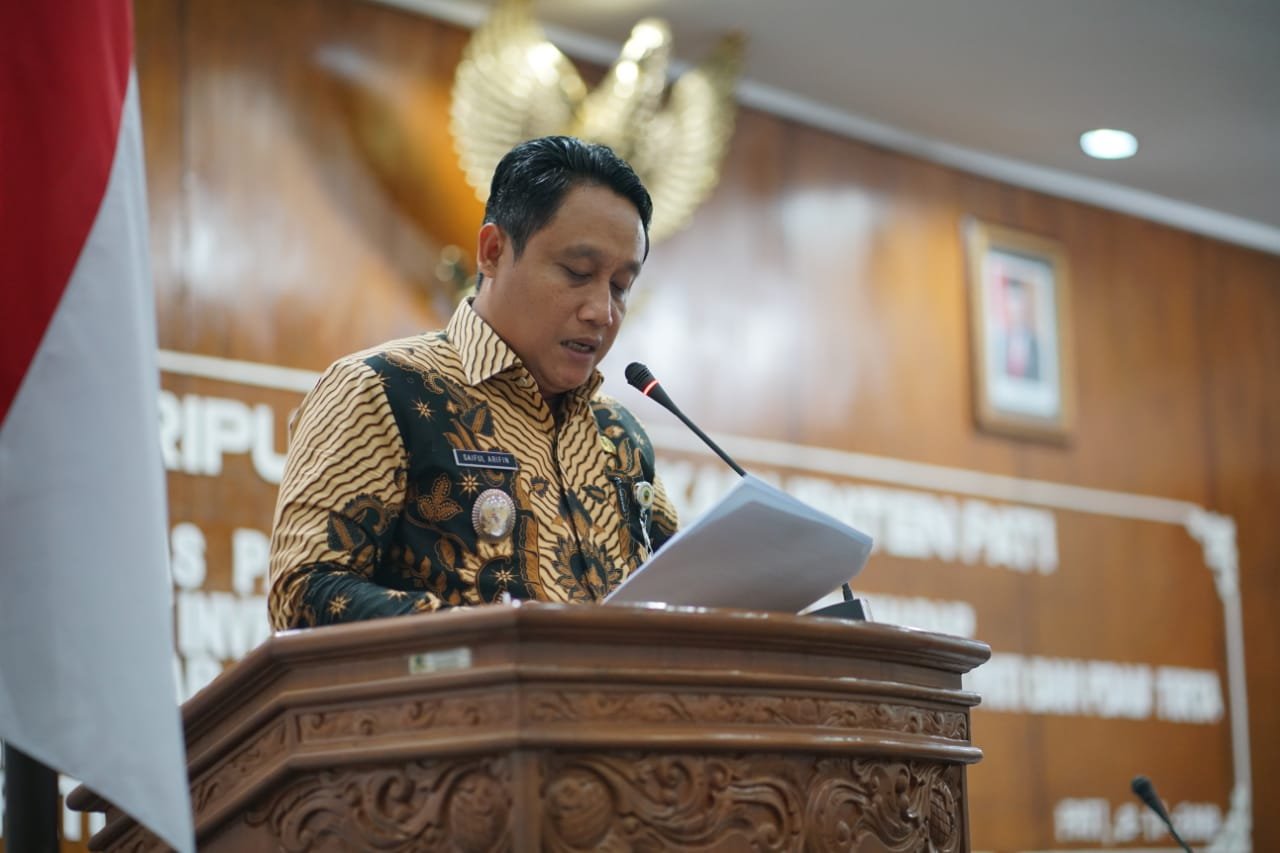Safin berkesempatan membacakan sambutan Bupati Pati Haryanto mengenai Penjelasan Eksekutif terhadap enam Rancangan Peraturan Daerah (Raperda) Kabupaten Pati.