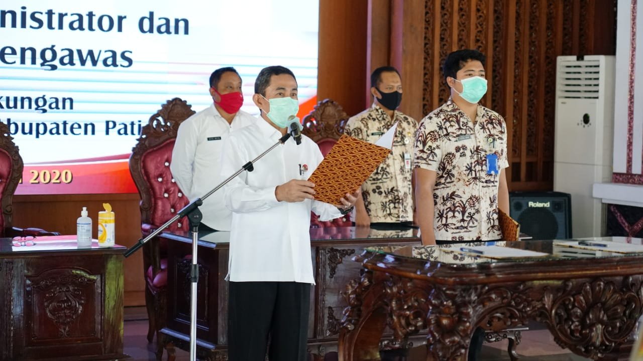 Pati, Bupati Pati Haryanto didampingi Wakil Bupati Pati Saiful Arifin (Safin), Sekda Pati Suharyono, dan Plt Kepala Badan Kepegawaian Pendidikan dan Pelatihan (BKPP) Jumani melantik dan mengambil sumpah empat Pejabat Administrator (eselon III – red) dan 13 Pejabat Pengawas (eselon IV-red) di Pendopo Kabupaten Pati. (04/06/2020).