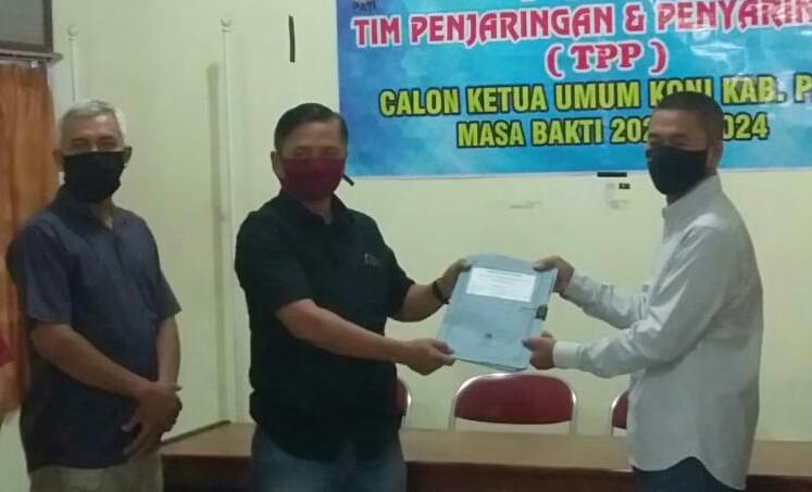 H. Mustamaji warga Juwana merupakan balon pertama yang menyerahkan berkas dengan mengisi dan menandatangani blangko tanda terima penyerahan berkas Balon Ketua Umum Koni Kabupaten Pati yang sudah diisi dilengkapi sesuai persyaratan yang harus dipenuhi.