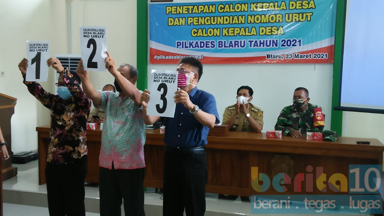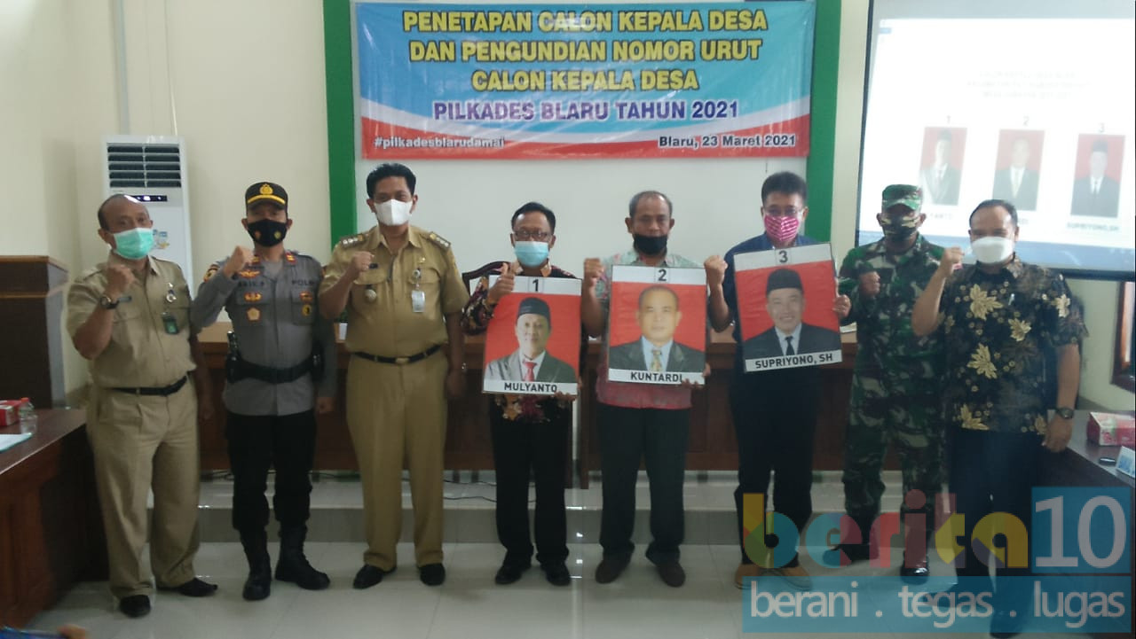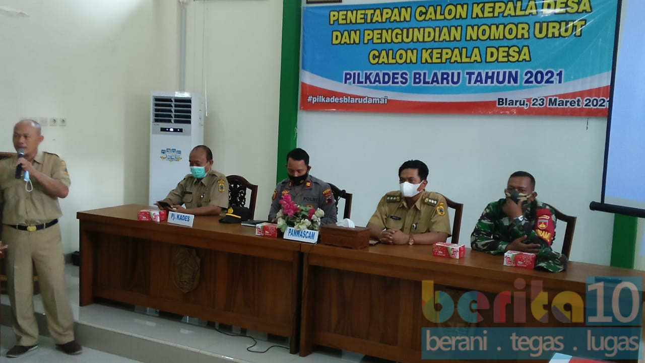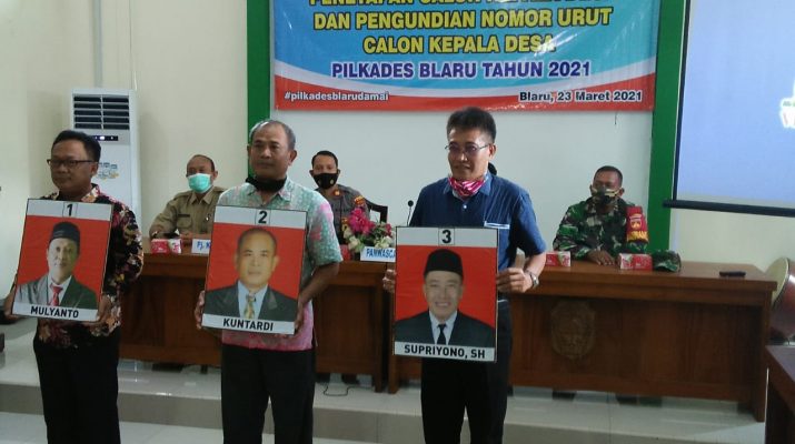 PJ (Penjabat) Kades Blaru Karyanto, SH di sela sela acara Penetapan Calon Kades dan Pengundian Nomor Urut menjelaskan bahwa dalam Pilkades kali ini ada tiga kandidat yang ikut mendaftar. Mereka telah mengikuti tahapan dengan baik dan lancar tanpa ada kendala. Dan saat ini memasuki tahapan krusial yang sudah ditunggu calon kades dan masyarakat. Dalam tahapan ini Mulyanto mendapat nomor urut satu, Kuntardi mendapat nomor dua dan Supriyono, SH mendapat nomor tiga. Dalam proses tahapan ini berjalan dengan lancar, aman dan damai, ungkap Karyanto. Pihaknya selalu berpesan sekaligus meminta supaya semua calan dan pendukung bisa mensukseskan pelaksanaan Pilkades di desa Blaru. Karena itu netralitas penyelenggara dalam hal ini panitia Pilkades dan BPD harus benar-benar terwujud dan terjaga dalam Pilkades Serentak. Di akhir acara dilakukan Deklarasi Damai Pilkades dalam bentuk penandatangan kesepakatan untuk mensukseskan jalannya Pilkades Damai, Aman dan Lancar di desa Blaru Pati Kecamatan Pati, yang dilakukan calon Kades, Panitia Pilkades, BPD, Panwascam, tokoh agama, tokoh pemuda dan tokoh masyarakat. Tim