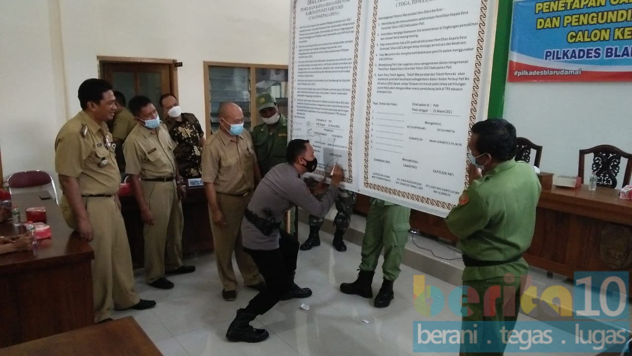 Pati, Berita10 – Pemerintah Kecamatan Pati bersama jajaran Polsek dan Koramil berharap Pemilihan Kepala Desa (Pilkades) Serentak Tahun 2021 di wilayah Kecamatan Pati bisa berjalan dengan damai, aman dan lancar. Dalam rangka mewujudkan suksesnya pelaksanaan Pilkades Serentak yang luber dan jurdil di wilayah Kecamatan jajaran Panwascam dalam hal ini Camat, Kapolsek dan Danramil selalu mendorong adanya netralitas panitia Pilkades dan BPD dalam tahapan Pilkades Serentak. Dalam mewujudkan Pilkades Serendak damai, aman dan lancar di Kecamatan Pati peran aktif balon Kades, panitia Pilkades, tim sukses dan pendukung serta masyarakat yang punya hak pilih untuk komitmen dalam mematuhi aturan yang telah ditentukan dalam semua tahapan Pilkades Serentak di Kabupaten Pati khususnya di wilayah Kecamatan Pati. Netralitas dan kesiapan penyelenggaraan Pilkades Serentak salah satu kunci keberhasilan dan suksesnya Pilkades Serentak yang bakal digelar tanggal 10 April 2021.