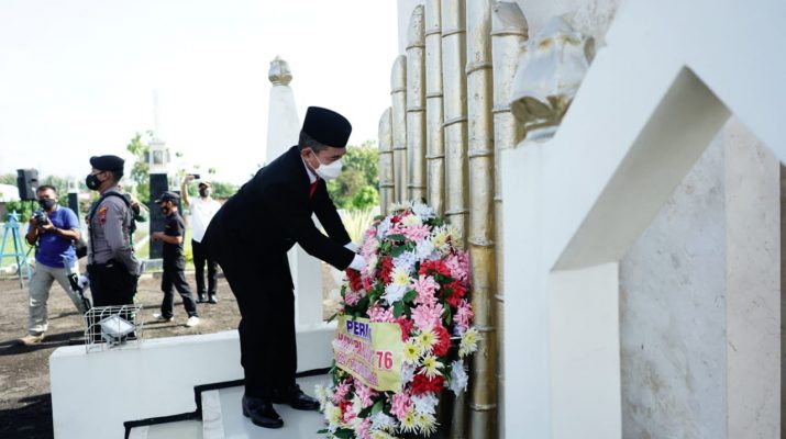 Bupati Haryanto mengajak semua yang hadir untuk mengenang sejenak jasa para pahlawan yang telah gugur dan kemudian dilanjutkan dengan peletakan karangan bunga.