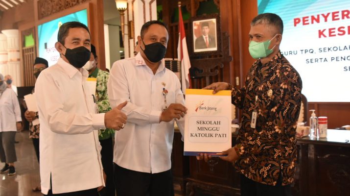 Pati, Berita10 – Bertempat di Pendopo kabupaten, Rabu (20/4), Bupati Pati Haryanto didampingi Wakil Bupati, Sekda, Kepala Disdikbud dan Direktur Bank Jateng menghadiri penyerahan bantuan kesejahteraan guru TPQ, sekolah minggu, dan Madrasah Diniyah (Madin) serta pengelola pondok pesantren tahun 2022 se-kabupaten Pati.