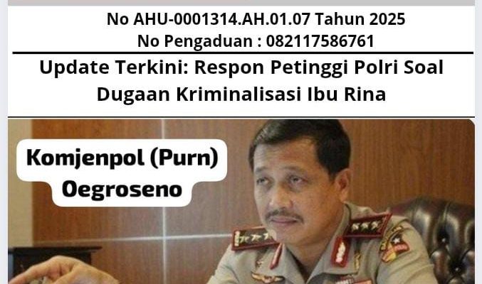 Jakarta, (GMOCT) – berita10 – Dukungan dari jajaran petinggi Polri mulai bermunculan terkait kasus dugaan kriminalisasi terhadap Ibu Rina Rismala Soetarya, seorang ibu muda yang sempat ditahan bersama bayinya oleh Polres Metro Jakarta Pusat. Dalam tangkapan layar pesan WhatsApp yang beredar pada Kamis (14/8/2025), Komjenpol (Purn) Drs. Oegroseno, S.H. dengan tegas menyebut kasus ini sebagai “murni kriminalisasi” dan meminta agar peristiwa tersebut diviralkan di media sosial.