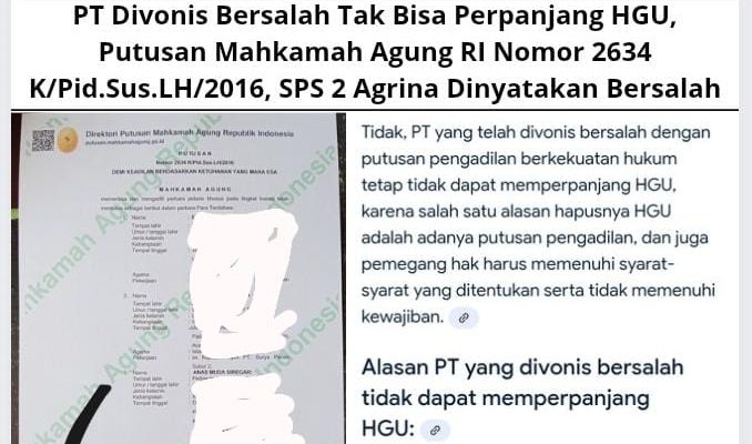 PT Divonis Bersalah Tak Bisa Perpanjang HGU, Putusan Mahkamah Agung RI Nomor 2634 K/Pid.Sus.LH/2016, SPS 2 Agrina Dinyatakan Bersalah