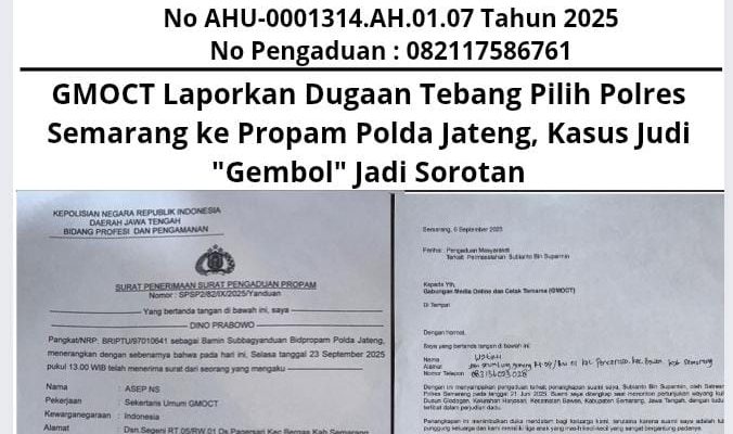 Semarang, (GMOCT) – berita10 – Gabungan Media Online dan Cetak Ternama (GMOCT) secara resmi melaporkan dugaan praktik tebang pilih dalam penegakan hukum kasus perjudian