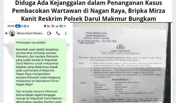 Nagan Raya, (GMOCT) – berita10 – Kasus pembacokan yang menimpa Ridwanto Agustus 2025 silam, seorang wartawan di Nagan Raya, memunculkan sejumlah pertanyaan terkait penanganan